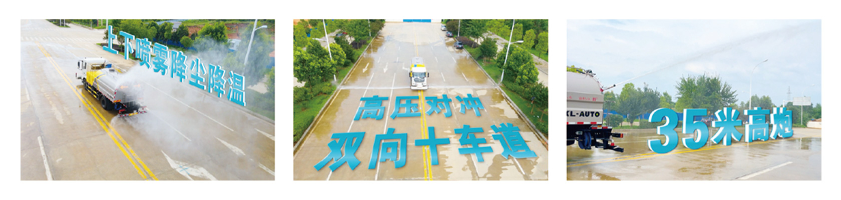 具有独立的高、低两套水路系统,高压系统采用进口高压水泵,清洗效果好、用水量小,以高压力、低流量的方式清洗路面脏污,高效省水。低压系统具有路面洒水、降温、除尘、冲洗尘埃污物、路面养护、园林浇灌及应急消防等功能。