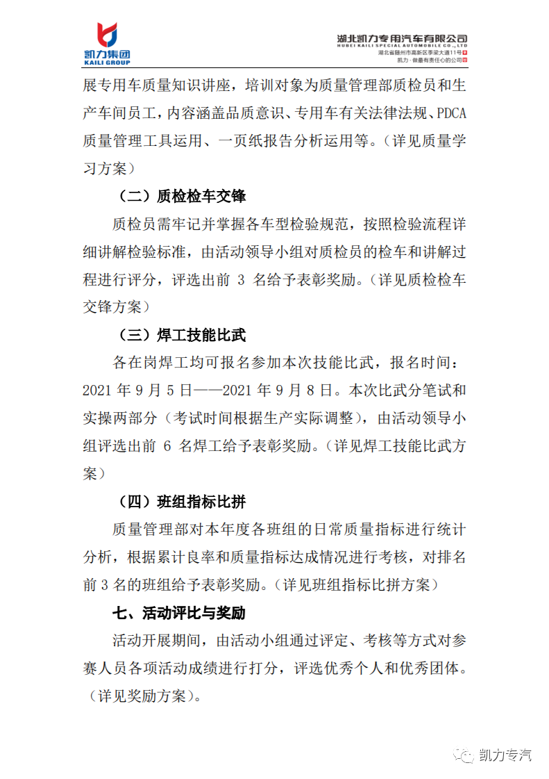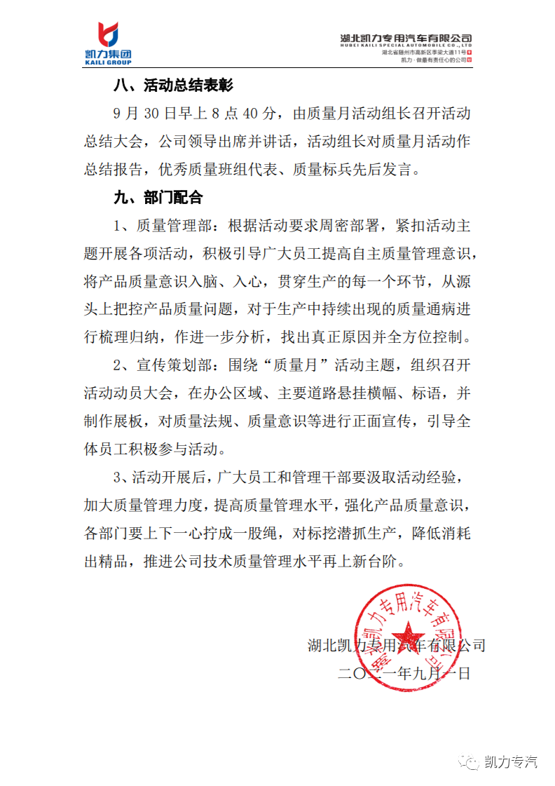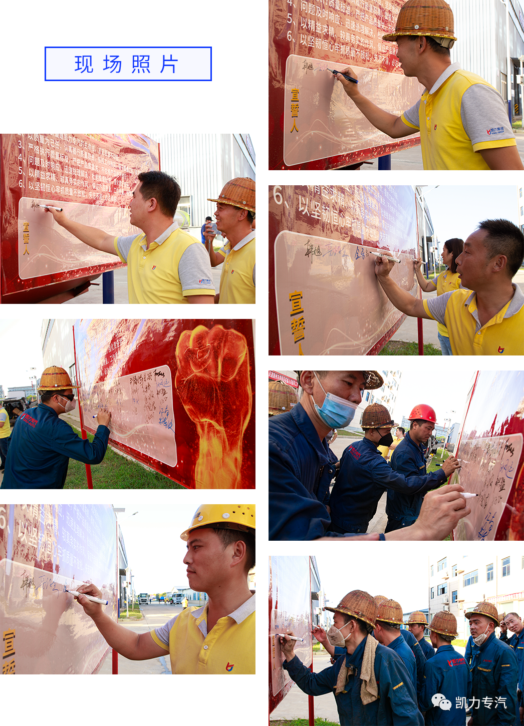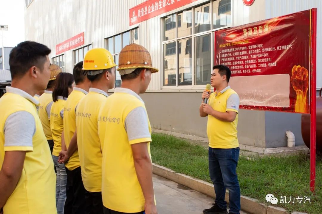 “我宣誓:时刻牢记质量是凯力专汽的生命线,坚定思想不动摇;以质量为己任,认真履行质量职责,狠抓工作落实,坚守质量红线,捍卫质量尊严;严格执行质量标准,严把产品质量关,不合格产品绝不放行;问题及时响应,迅速处理解决,杜绝推诿扯皮,强化责任担当;以精益求精、较真务实的作风,保证产品质量、工作质量、经营质量……”9月10日,随着铿锵有力的誓言在公司综合办公大楼前响起,公司2021年“质量月”系列活动正式拉开序幕。公司梁俊总经理出席活动,质量总监韩旭主持活动。