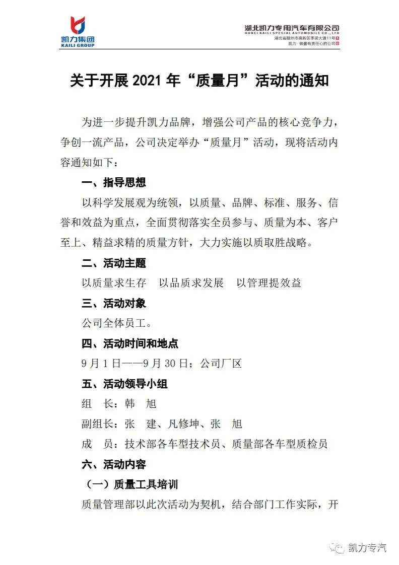 为贯彻落实集团公司部署开展9月份“质量月”活动的要求,公司第一时间下发了《关于组织开展2021年“质量月”活动的通知》,成立了“质量月”活动领导小组,活动以“以质量求生存、以品质求发展、以管理提效益”为主题,制定了系列活动内容,划分了活动时间段,任务明确,措施到位,责任到人;制定了加强策划、宣传交流、抓实基础、深化专项治理、技能大比武的工作要求;并要求基层各领导小组全面梳理、明确思路、总结经验,及时概括好做法、好举措、好亮点,做好活动总结及相关考核。
