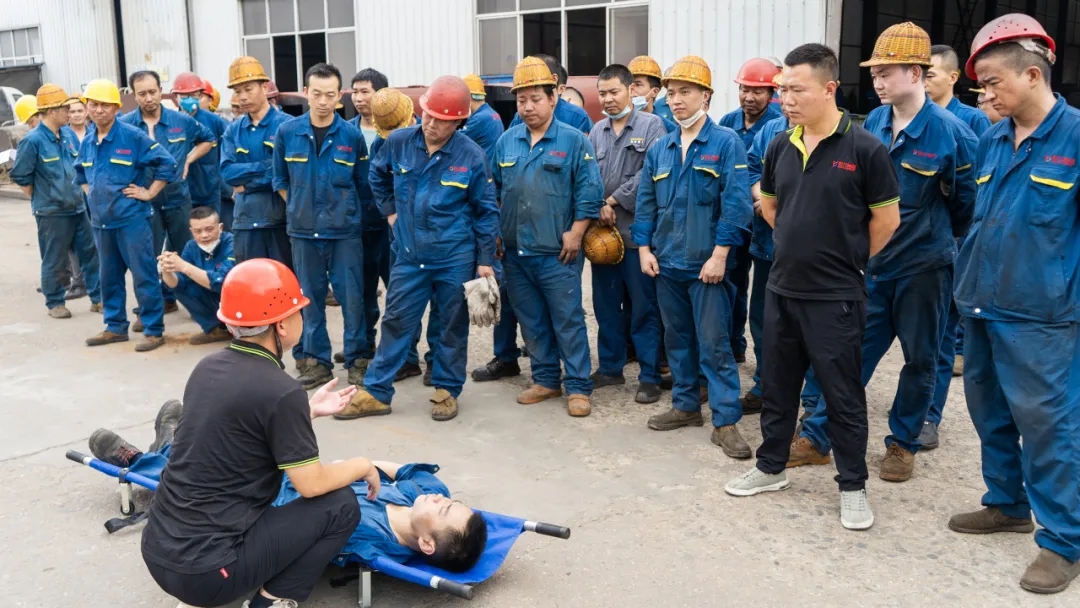 此次演练模拟了车间一线工人在作业过程时中暑晕倒,经现场工友发现后,立即通知班组长,班组长接到险情后迅速启动应急预案,抢险救援组立即赶往事发位置,将中暑人员转移至安全地带,经过人工物理降温、喂服防暑药品等紧急处置,现场中暑人员逐步恢复意识,脱离危险,并通知救护车送往就近医院接受救治的全过程。