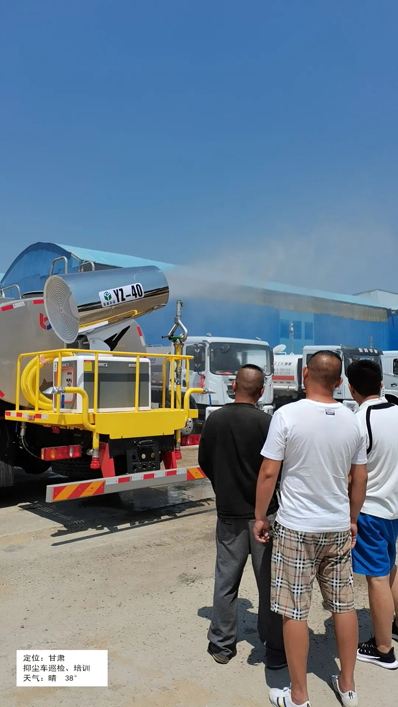 甘肃,连续高温天气,当日温度高达38度,售后人员对客户刚购买的抑尘车进行车辆巡检,功能测试培训,现场对新意向客户进行产品讲解和答疑解惑