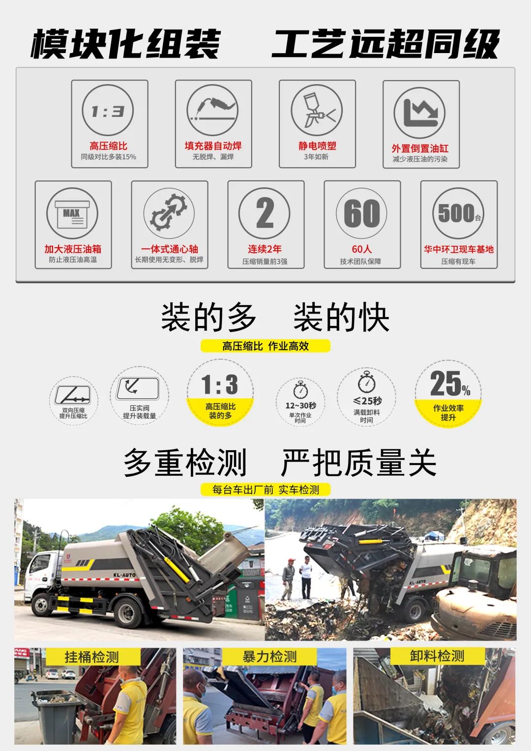 优势四:采用最新的外置油缸结构和双向压缩技术,通过国内国外一流品牌配件,实现压缩比超过 1:2.5,单次循环≤20 秒,达到了垃圾收集效率的成倍提升。