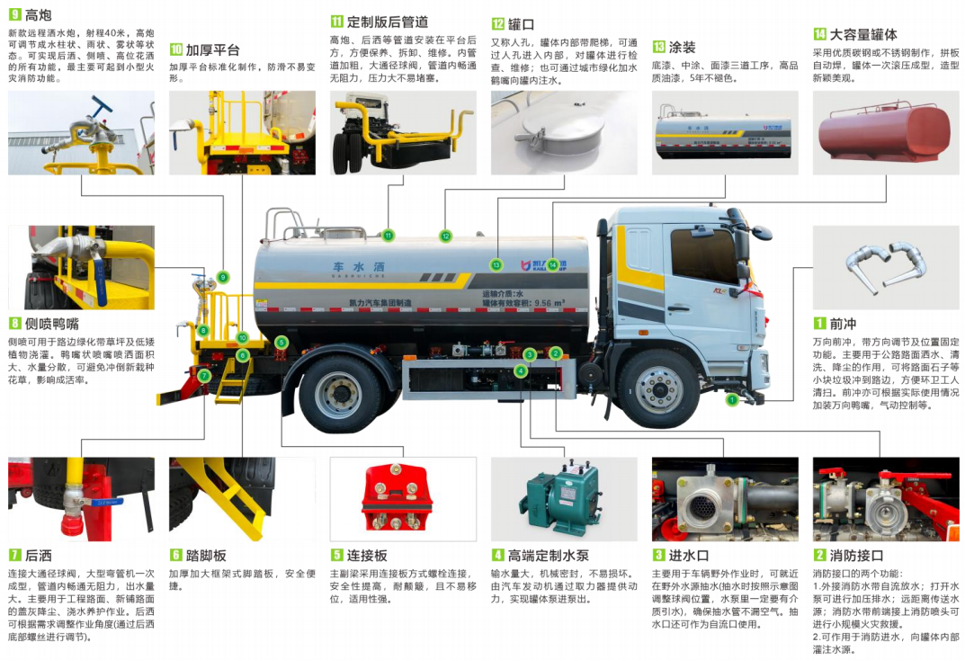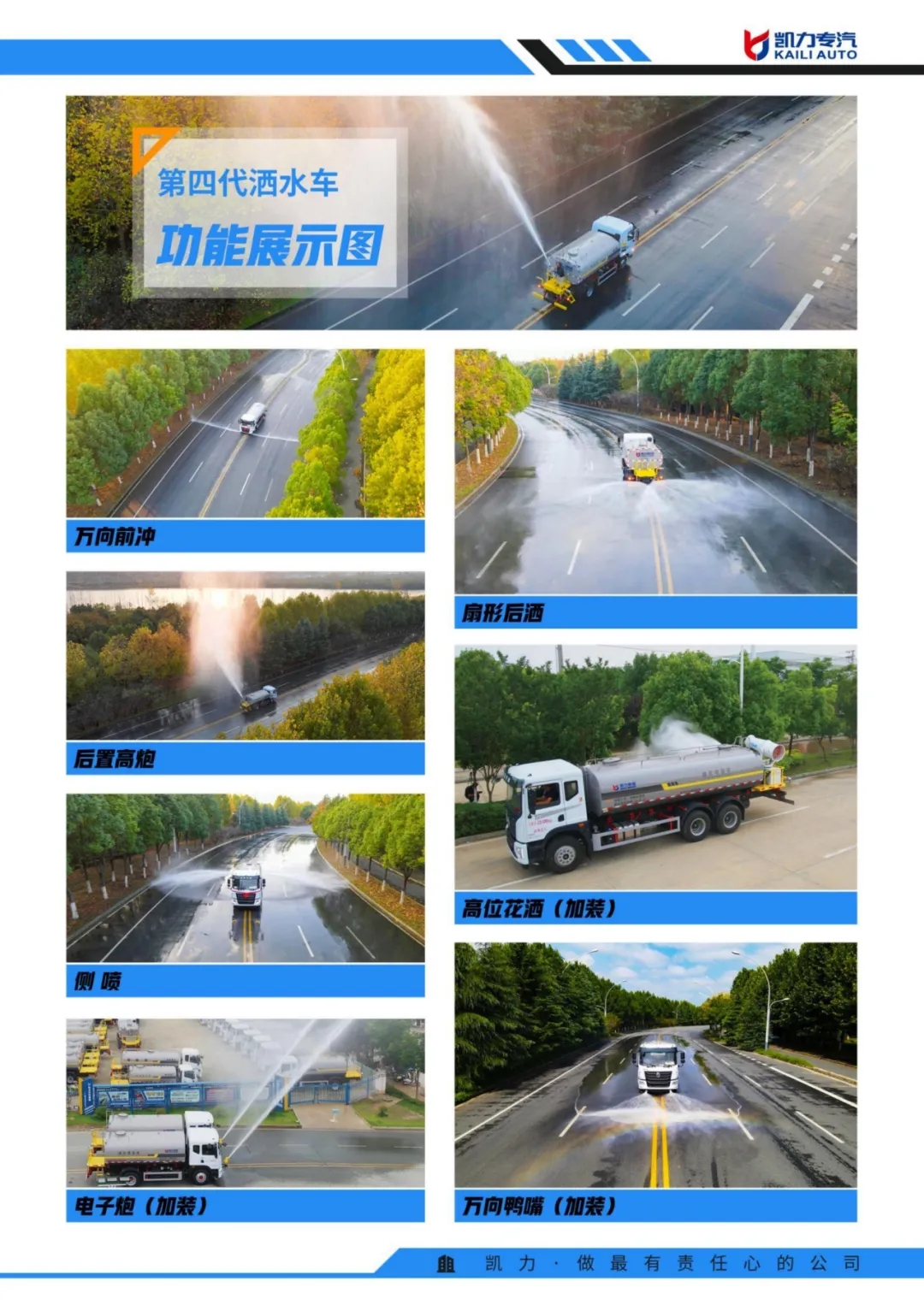 产品标配前冲、后洒、侧喷、后置式工作平台、平台上有高压水炮(可360°旋转,水雾形状可调成直冲状、 大雨、 中雨、 小雨、毛毛雨;调成直冲状最大射程≧ 35 米,也可调成雾状最大射程≧15 米)、配备优质大功率专用洒水泵,品牌取力器、杂物过滤网、国标通用 65型消防接口(可通过消防栓加水)、1 套自流球阀系统(可自吸自排,最大吸程 7 米)、2根引水钢丝胶管。适用于各种路面清洗;树木、绿化带、草坪绿化;道路、厂矿企业施工建设、高空建筑冲洗。具有洒水、压尘、高(低)位喷洒、农药喷洒、护栏冲洗、应急消防等多种功能。