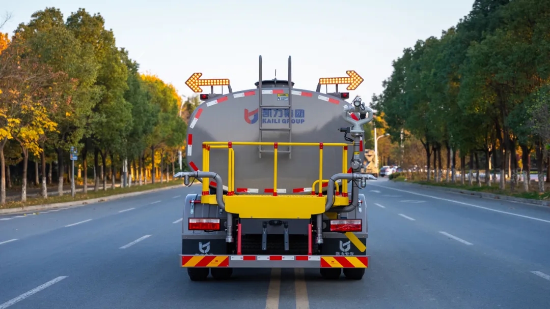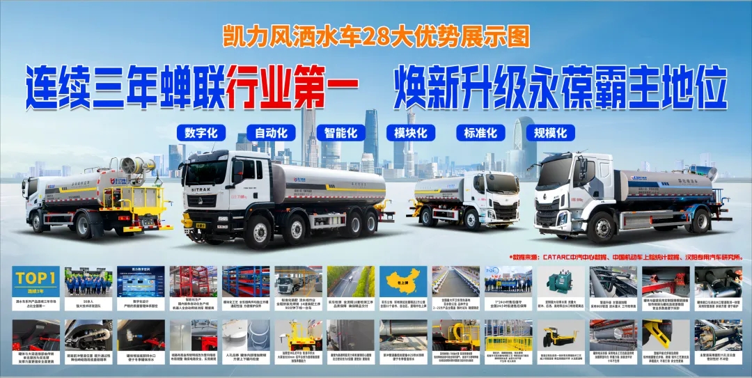凯力风东风D9洒水车是湖北凯力专用汽车有限公司自主研发设计的第4代环卫装备,性能达世界领先水平,年产销超10000台。标配前冲、后洒、侧喷等,还可选装高压水炮、消防接口等,适用于多种场景,具有多种功能。凯力风洒水车已连续三年荣膺全国销量第一名。