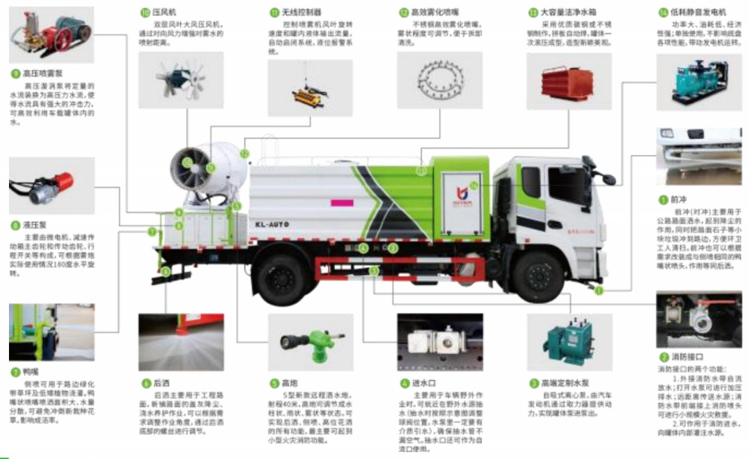 配备优质大功率专用洒水泵,取力器,杂物过滤网,国标通用 65 型消防接口(可通过消防栓加水),2 根引水钢丝胶管。水泵、取力器、球阀、滤网均为国家标准产品,主管道加粗,法兰垫、法兰盘加厚,万向前冲,大通径球阀,具有性能优良,工作可靠、效率高、流量大。尾部雾炮能有效的对雾霾、灰尘进行有效的抑制效果。